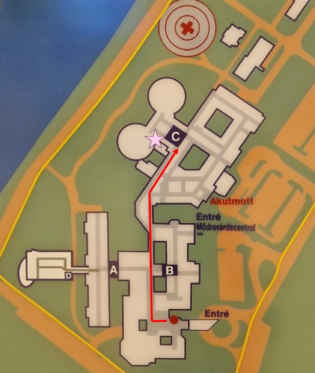 Från huvudentrén tar du höger, följ den blå linjen med våra kaniner som visar vägen. Gå mot hisshall C. Ta trappa eller hissen ner till plan 2 där Barn och Neo-avdelningen ligger, precis till höger när du kliver ur hissen. Välkomna hem till Gotland!