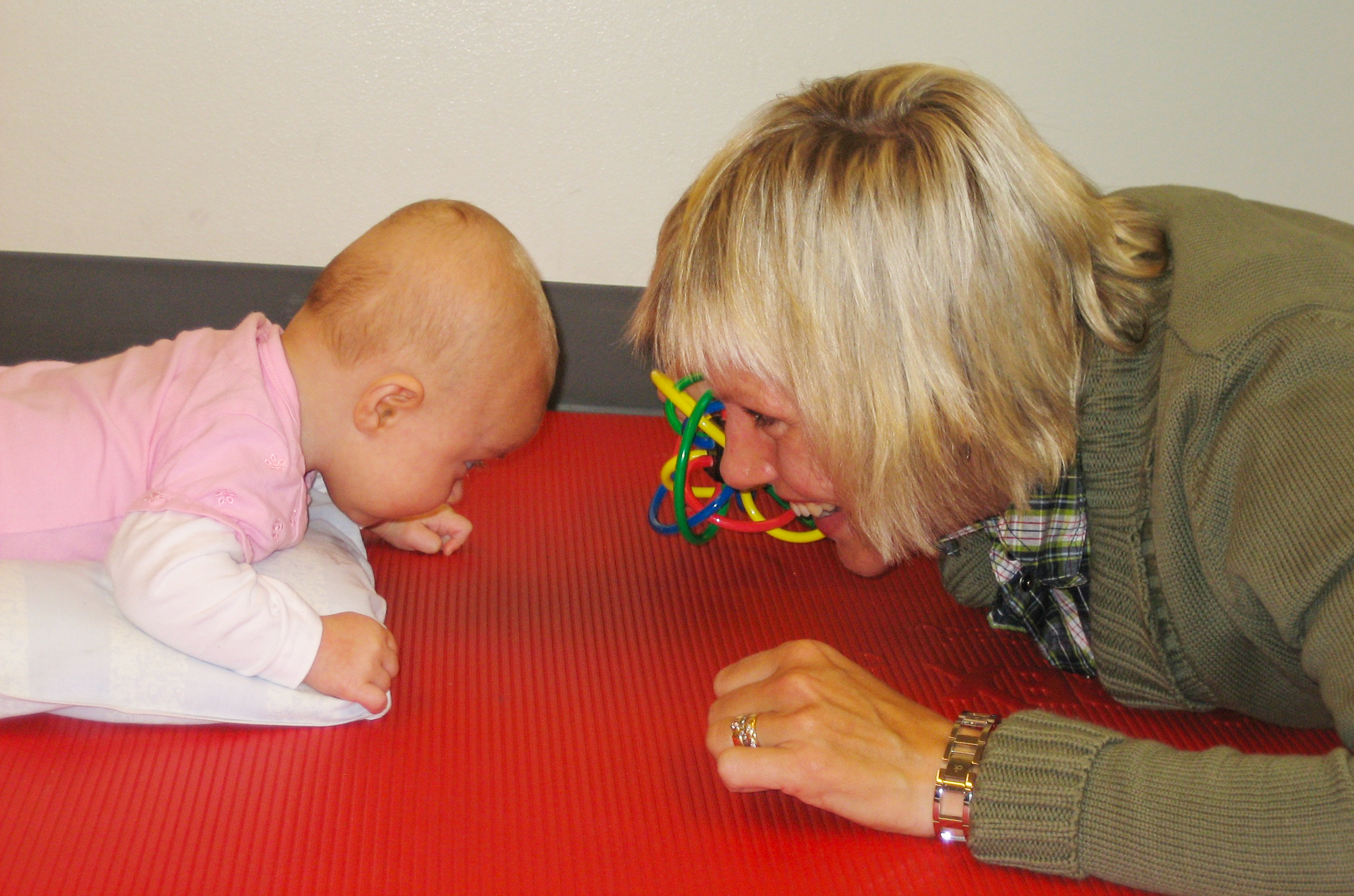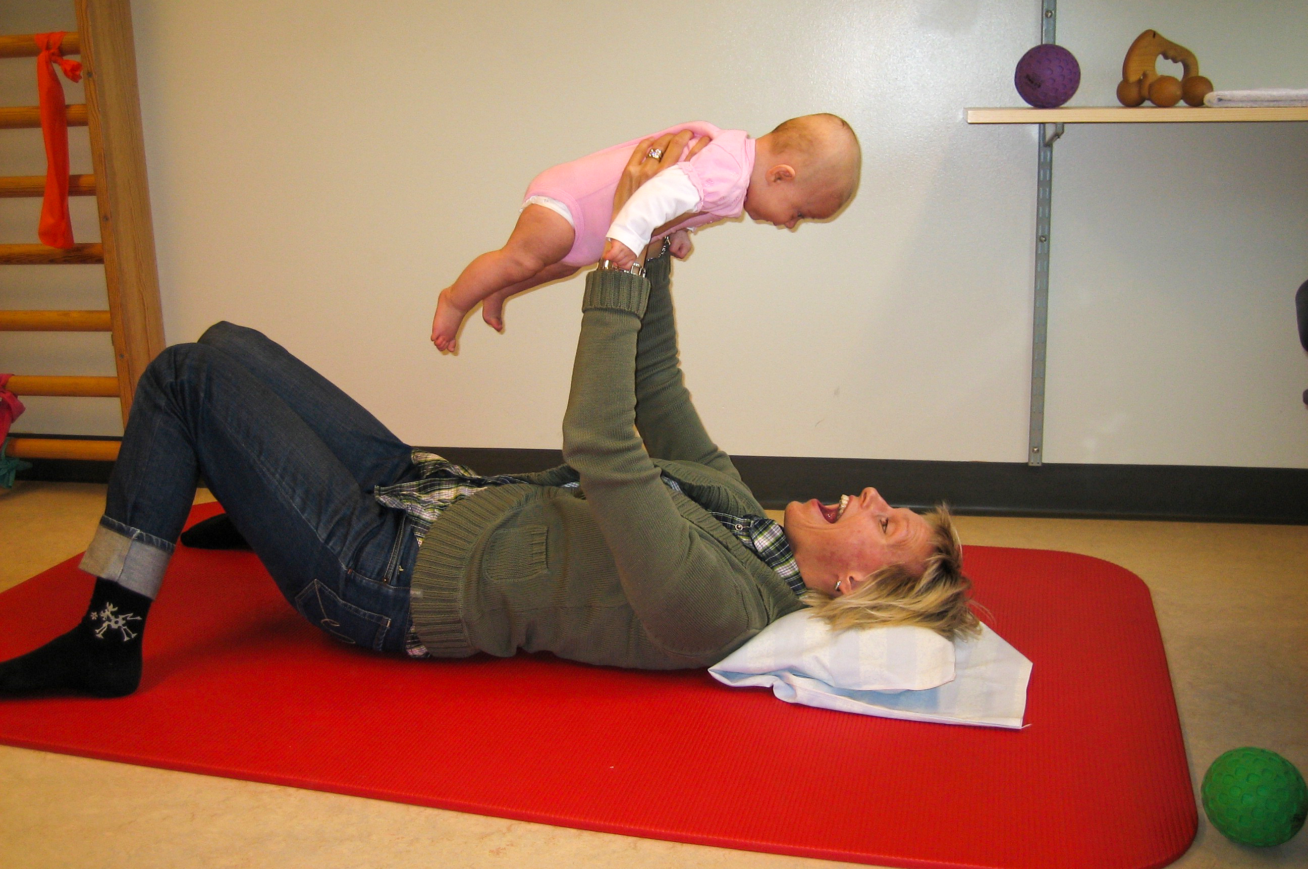 Att halvligga med barnet mage mot mage är mysigt och tryggt. Det ger bra tillfälle till kommunikation samtidigt som huvudkontroll tränas.