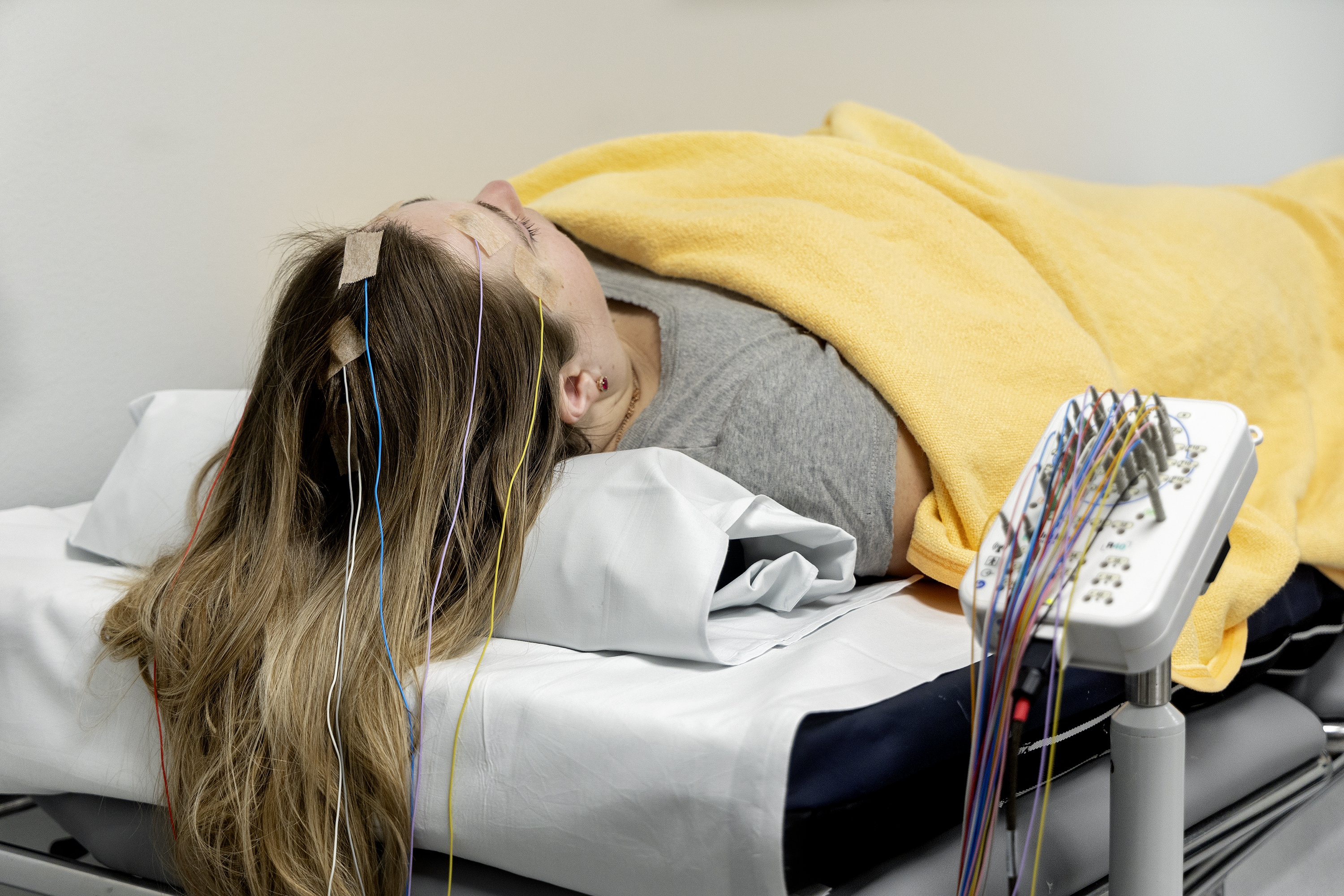 Under ett sömn-EEG får du sova på mottagningen med elektroder fästa i hårbotten. Elektroderna hålls på plats med en klibbig gel. Från dem går tunna sladdar till en EEG-apparat med en bildskärm.