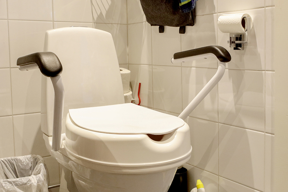I denna kategori ingår olika anpassningar för toaletter och badrum. För toalettstolen finns olika typer av armstöd, ryggstöd, förhöjningar och anpassade sitsar. Det finns även flyttbara toalettstolar, bäcken och kärl för att samla upp urin.