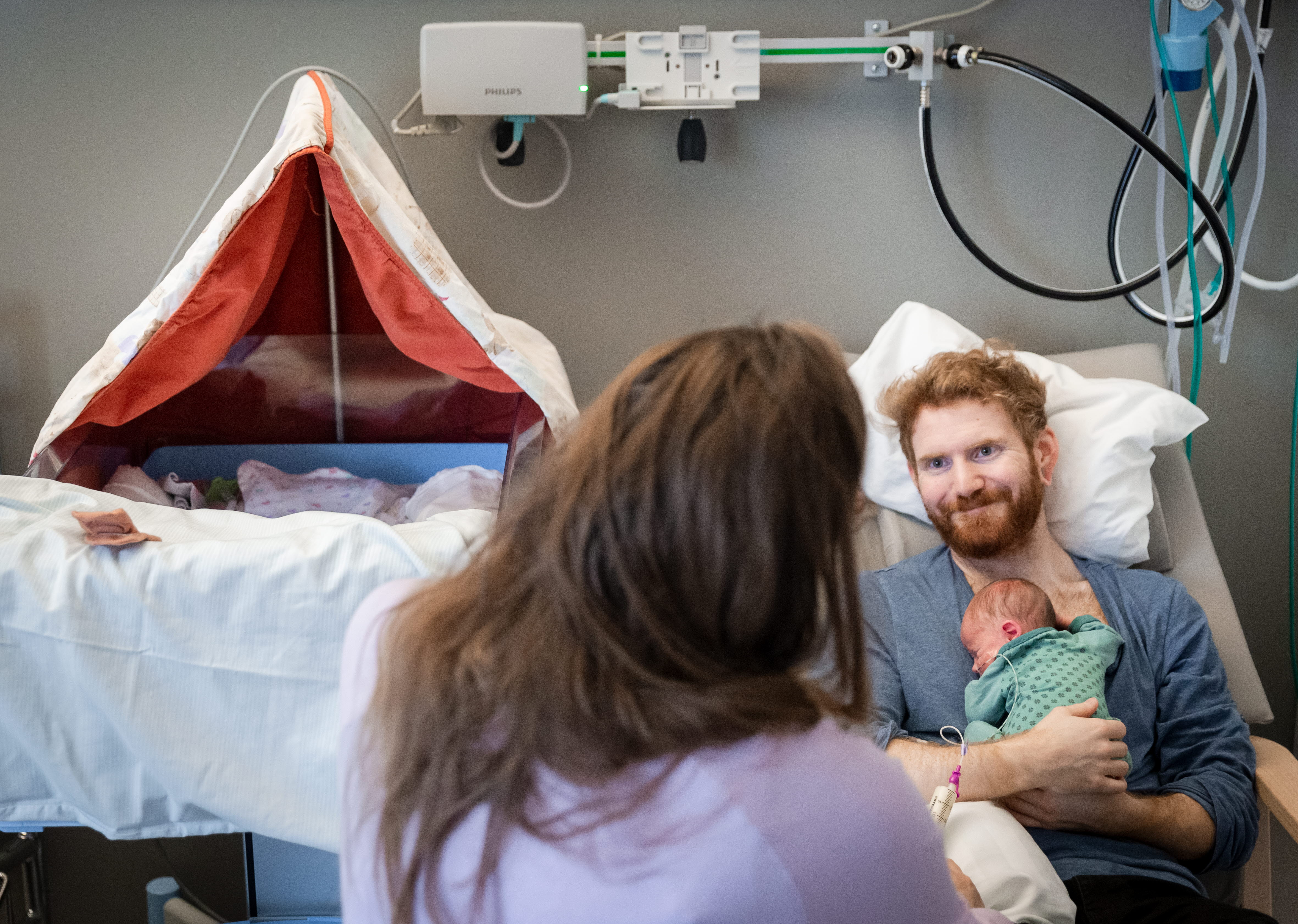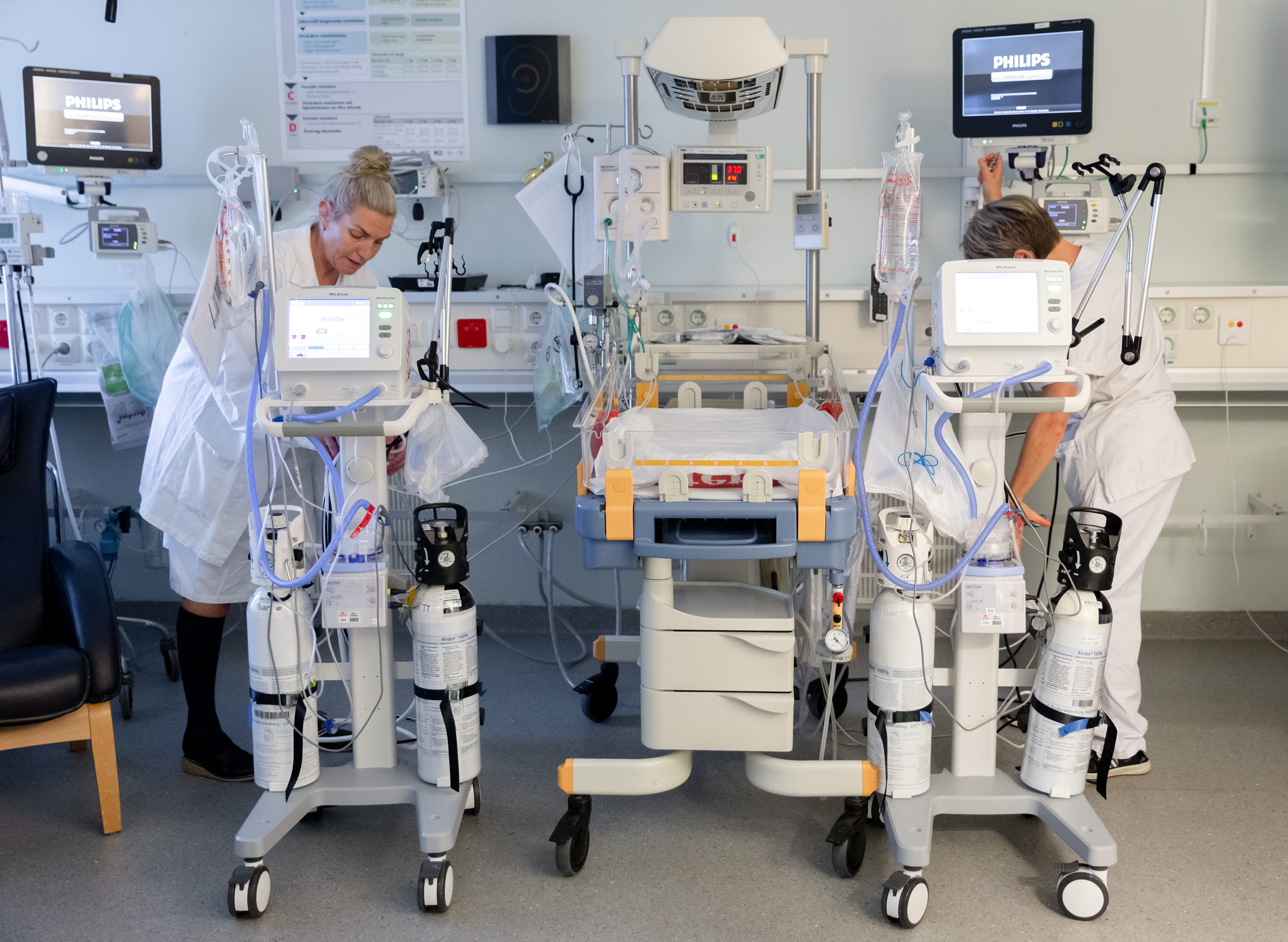 Många barn på neonatalen vårdas med en så kallad CPAP som hjälper barnet med sin andning. Barnet har EKG uppkopplingar på bröstet som visar hjärtfrekvensen samt en saturationskoppling på foten som visar hur barnet syresätter sig.