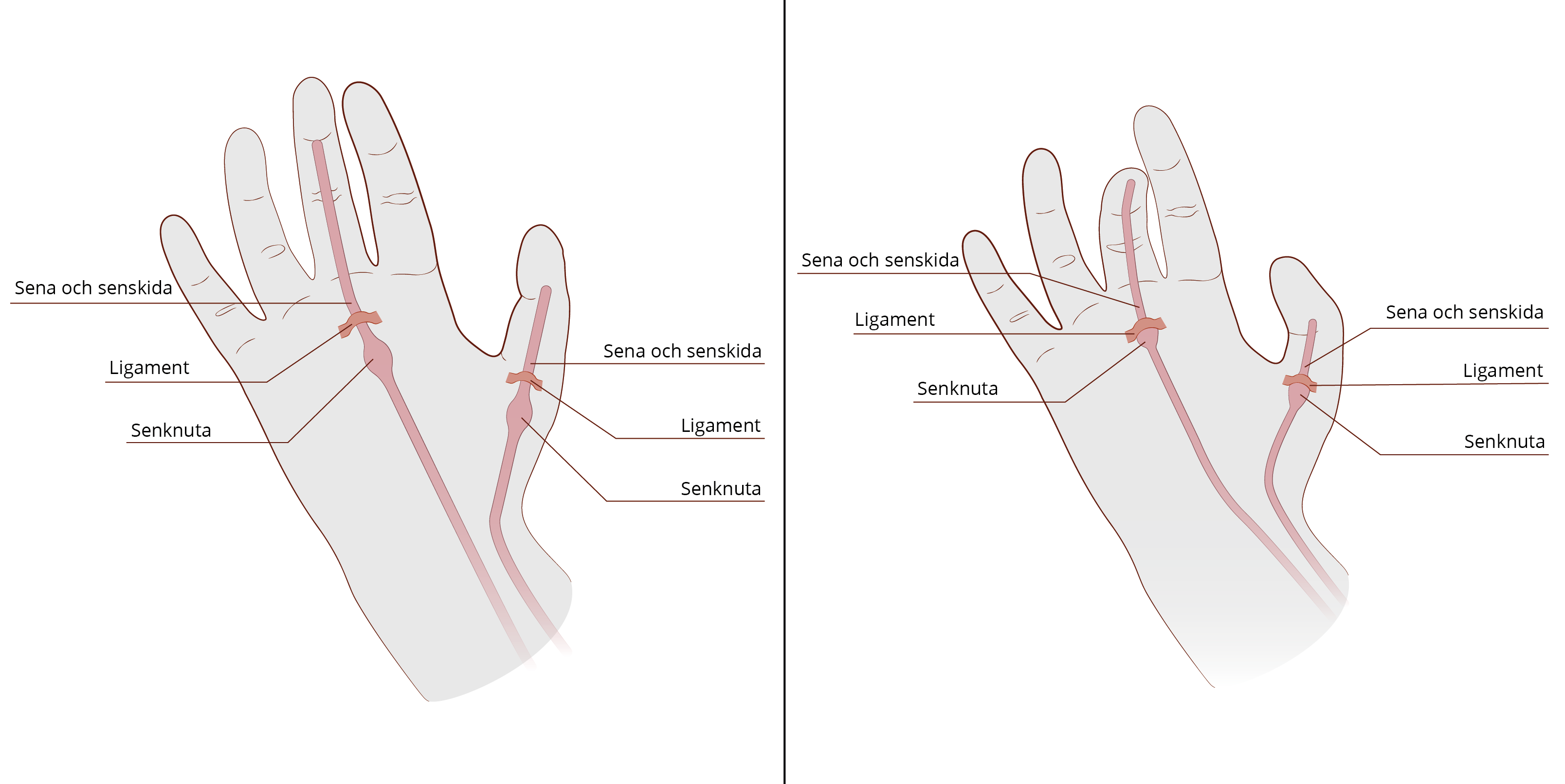 Du kan böja dina fingrar med hjälp av senor i handflatan. Runt dem finns så kallade senskidor och ligament. De hjälper senorna att glida när du böjer och sträcker på ett finger.