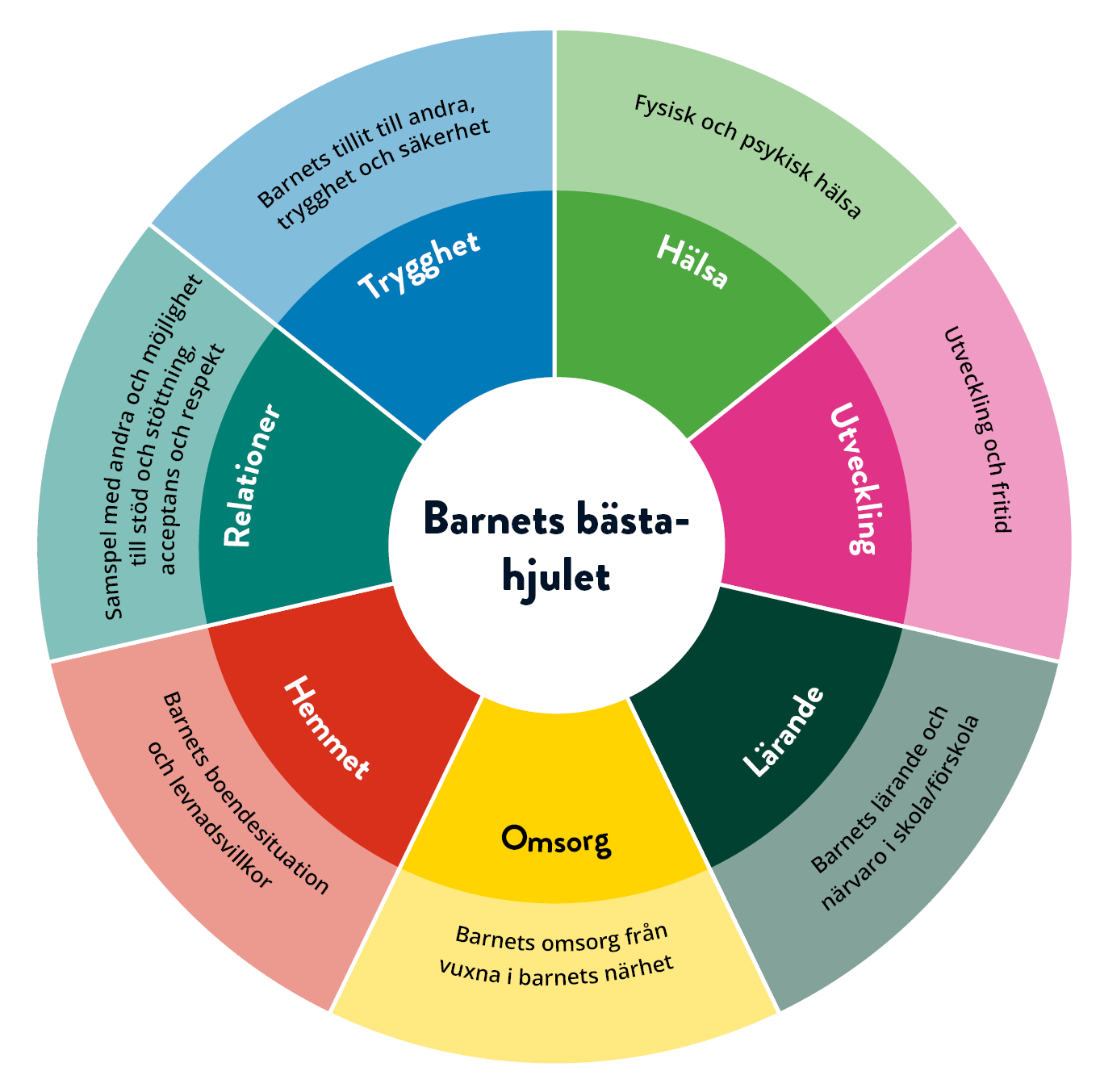 För att komma fram till hur just dina behov ser ut använder vi oss av Barnets bästa-hjulet. Det har sju delar som är viktiga för att du som barn eller ungdom ska ha det bra.