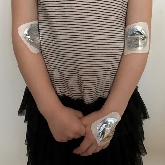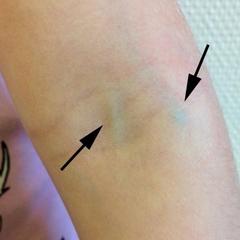 Titta på barnets händer och armveck. Leta efter ett bra blodkärl – det ser ut som en blågrön linje under huden. Om du behöver kan du klämma försiktigt runt handleden eller armen så kärlet syns bättre. Sätt plåstren där kärlen syns och känns tydligast.