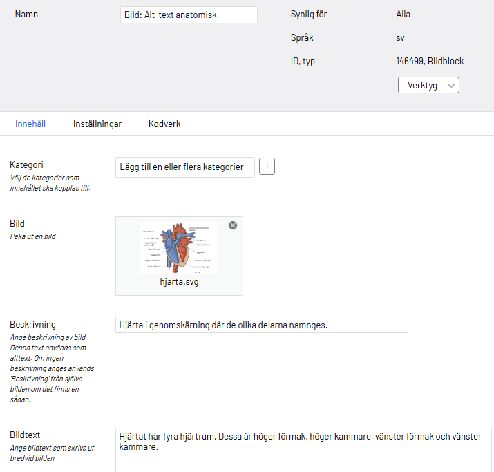 Skriv in en allmän alt-text när du laddar upp bilden i resursbiblioteket, till exempel “En lunga”. Du kan sedan anpassa alt-texten på artikelsidan så att alt-texten är relevant för artikelns innehåll, om det behövs. Till exempel “En lungas luftceller kallas alveoler”. Ändringar i bildblockets alt-textfält påverkar inte alt-texten i resursbiblioteket.