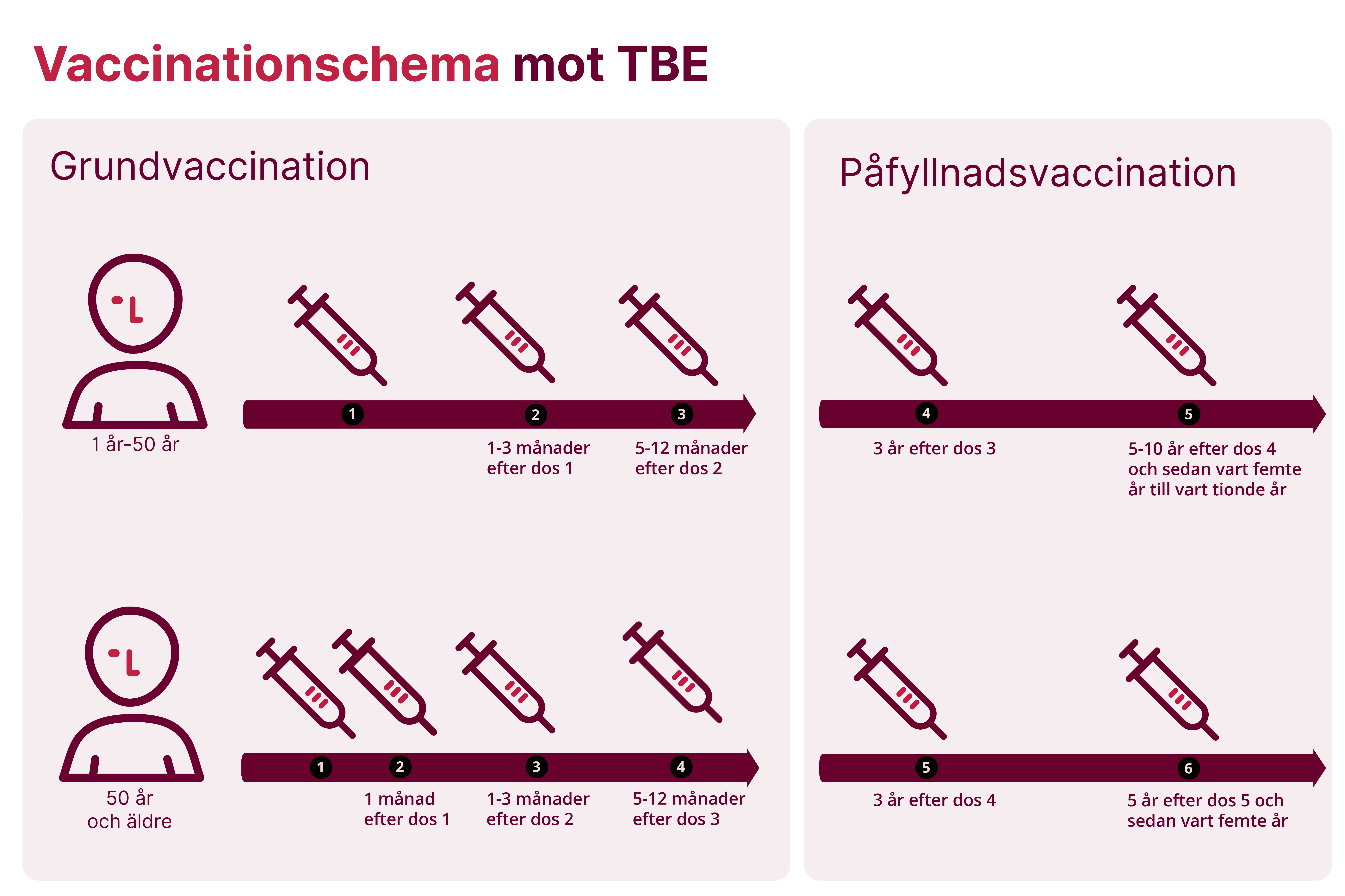 - Femte dosen, tre år efter den fjärde dosen.