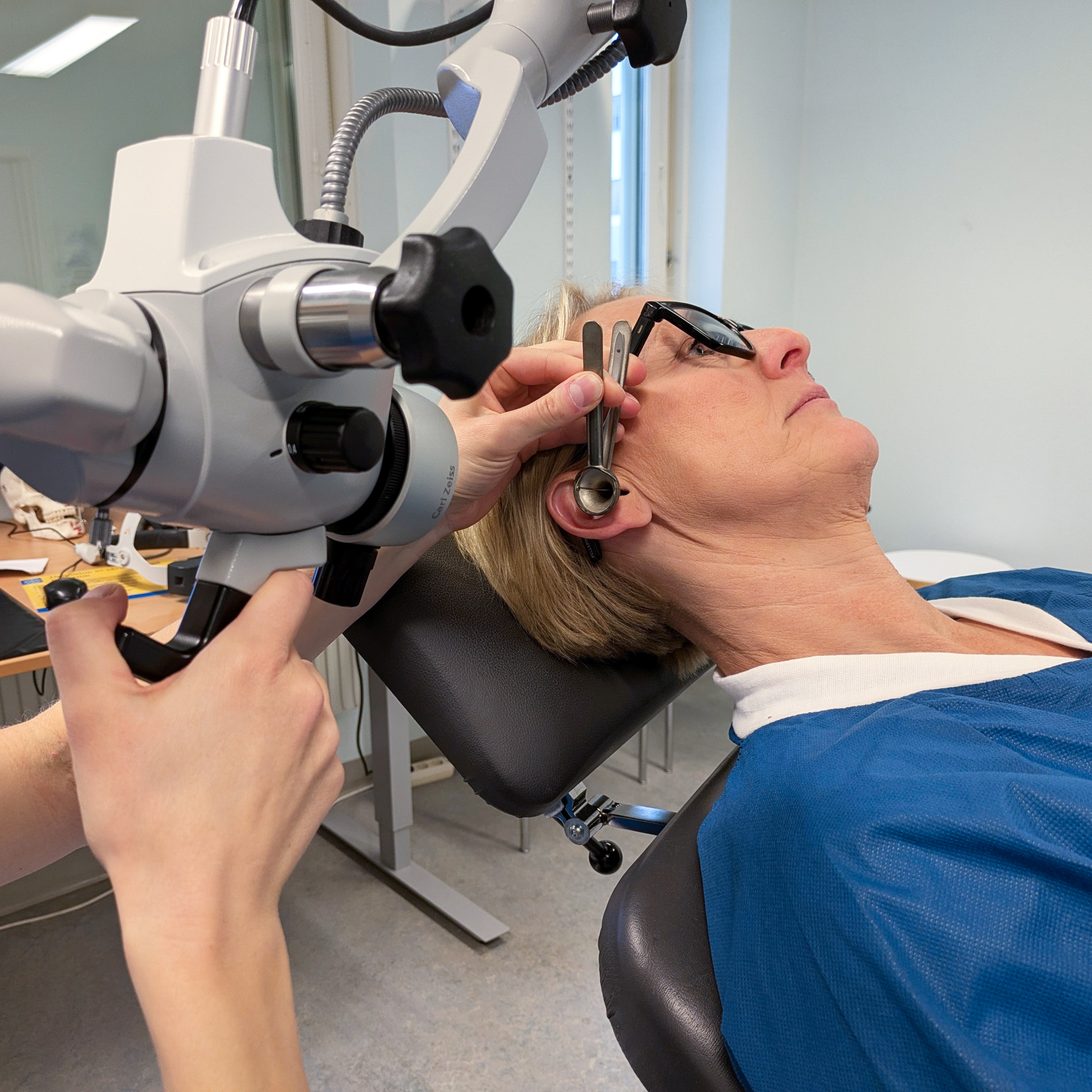 Vid undersökning av öron används ett mikroskop. Ofta undersöks du med stolen i en liggande position. Ett spekulum eller en tratt används i hörselgången för att skapa bättre insyn. På bilden visas ett spekulum.
