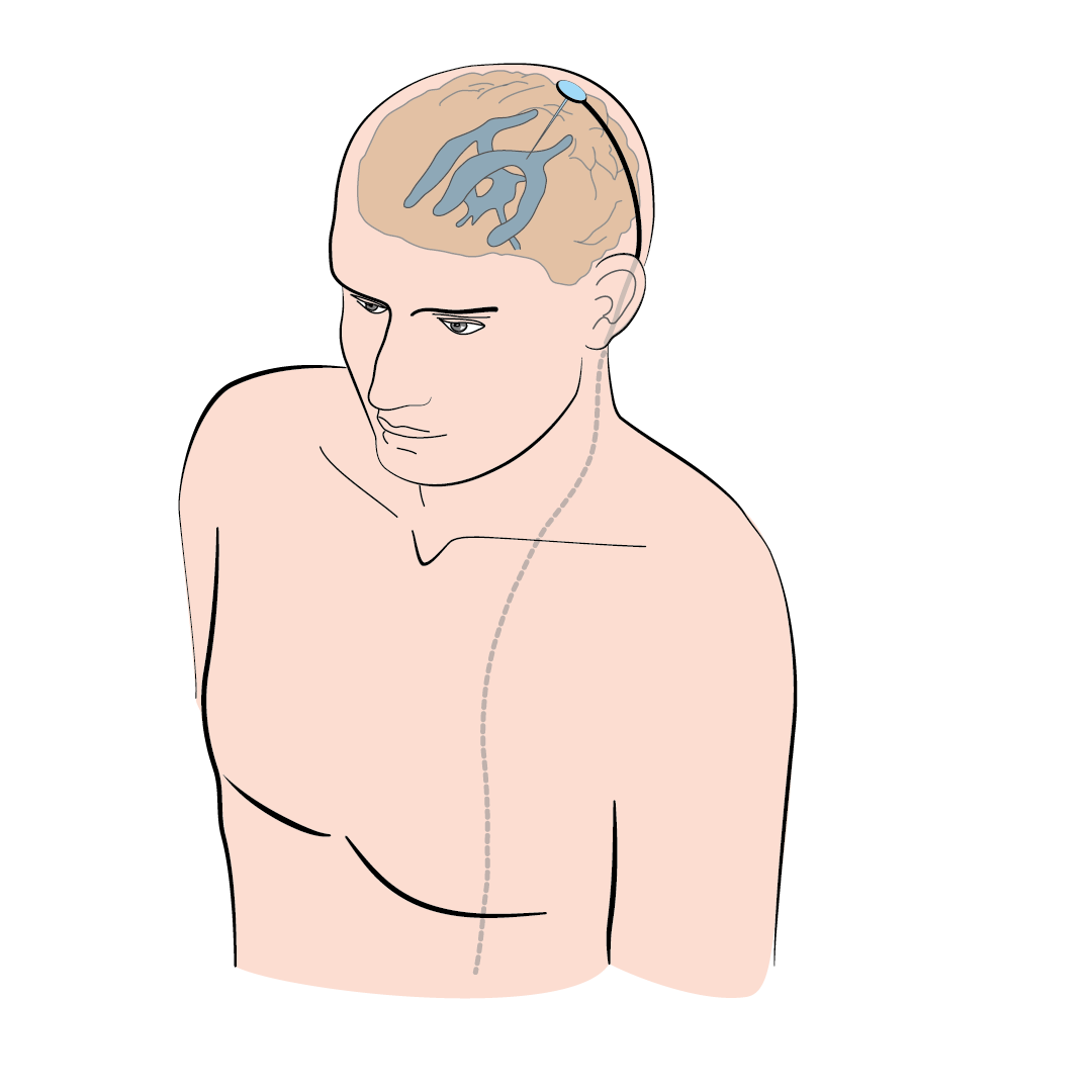 • Ett litet snitt i huvudet för att föra in slangen i hjärnan. Där borrar kirurgen ett litet hål i skallbenet.