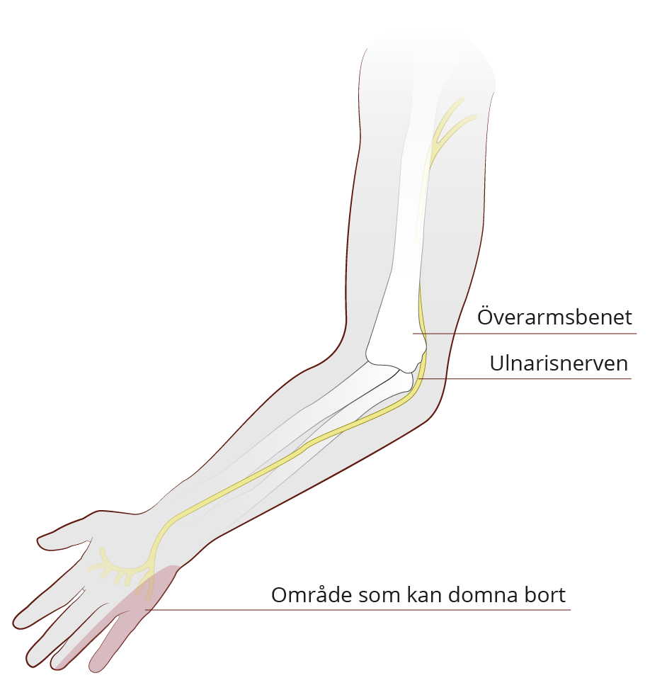 Ulnarisnerven kan utsättas för tryck och ge domningar i ringfingret och lillfingret.