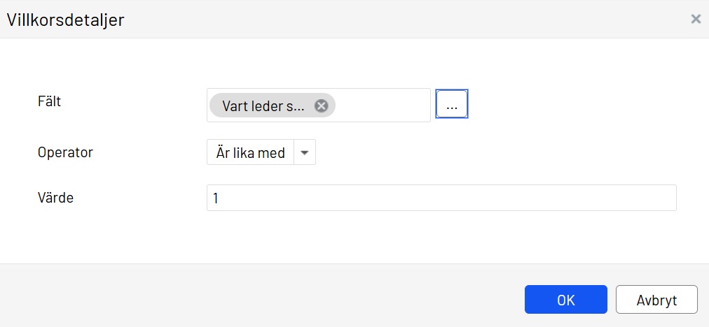 Lägg till villkor genom att klicka på + längst ner. I fönstret som öppnas väljer du Fält och det formulärelement som ska styra visningen av det element du är inne i. I Värde skriver du in det värde som du har gett formulärelementet som styr beroendet.