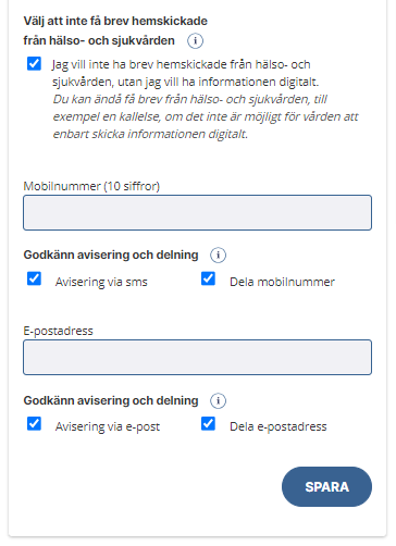 Du kan också välja att få information från vården digitalt i första hand, och välja om du vill dela ditt mobilnummer och/eller e-postadress med vården.