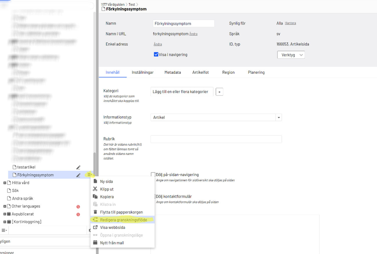 - Klicka på hamburgermenyn på den artikeln du vill ska granskas och klicka sedan på ”redigera granskningsflöde”. Detta steg kräver att du har admin-behörighet i Opti.