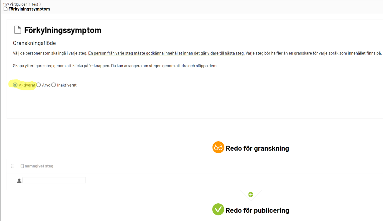 - Du ska starta granskning och har i stegen ovan valt ”redigera granskningsflöde” i Opti.