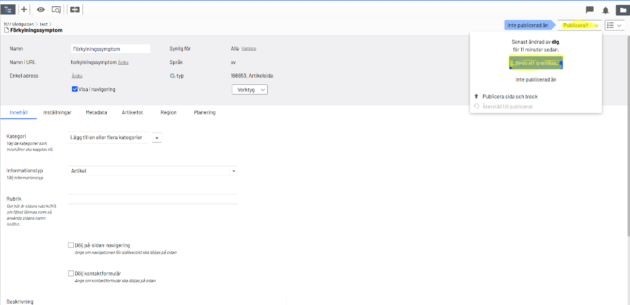 - Gör en ändring och klicka sedan upp rutan med publiceraknappen upp till höger. Nu ska du kunna se en knapp där det står ”Redo att granskas” i rutan.
