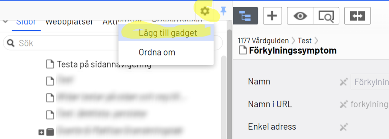För att enkelt kunna se att du är inne i ett granskningsutkast kan du lägga till gadgeten Versioner. Klicka på hjulikonen med inställningar ovanför trädstrukturen i vänsterspalten.
