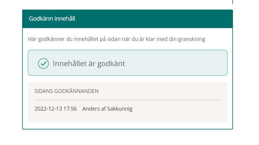 Granskaren godkänner slutligen sidan innehåll längst ner i granskningutkastet. Granskningen kan godkännas av flera granskare.