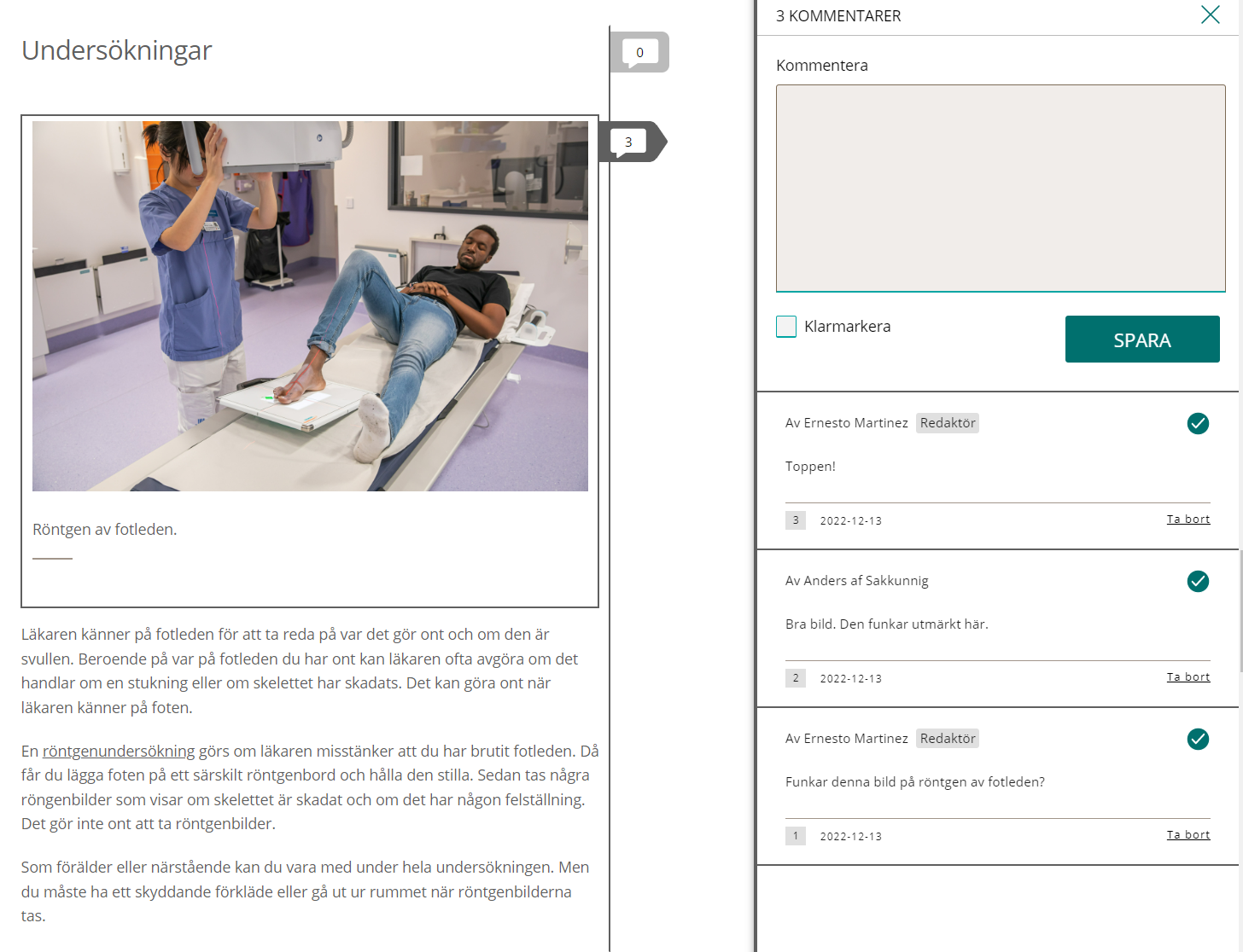 Som redaktör kan du kommentera allt innehåll i artikeln som är försatt i granskning genom att klicka på ”kommentarsbubblan” bredvid innehållet. Du kommer att få se en kommentarsruta i en panel där du kan kommentera innehållet, spara kommentaren och sedan även klarmarkera. I dessa rutor kan även granskare kommentera.