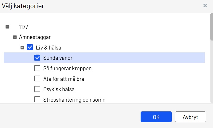 Klicka i kategori och underkategori. Du kan välja flera kategorier, kryssa för alla som är aktuella.