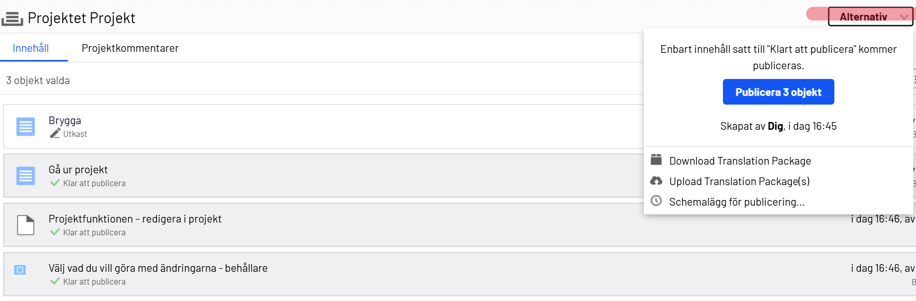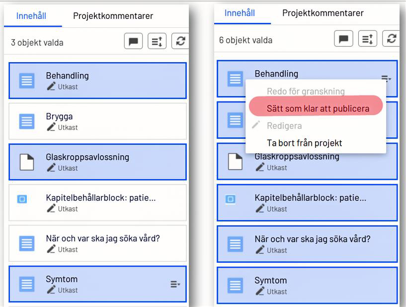 Med funktionen Projekt kan du revidera innehåll i flera artiklar och publicera alla ändringar samtidigt.