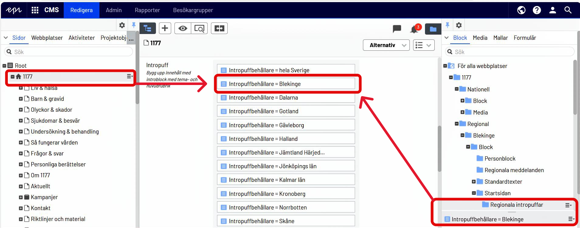 Innehåll: Dra in sidor från Opti-trädet eller Välj innehåll och Skapa ett nytt block.