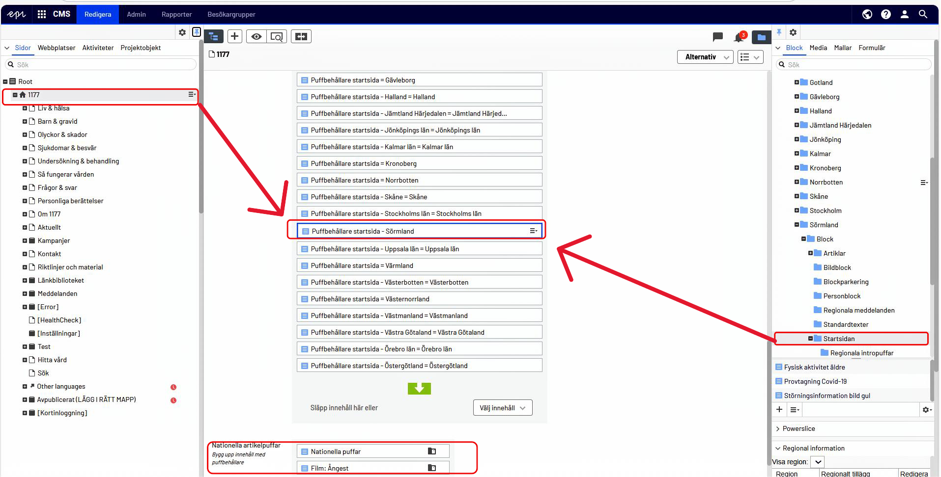 Skapa startsidespuffar i rätt puffbehållare på startsidan i Opti. Varje region har sin egen puffbehållare. De nationella startsidespuffarna har en egen innehållsyta under de regionala puffbehållarna.