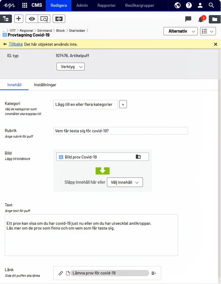 - Välj nytt innehåll och Skapa ett nytt block. Det blir automatiskt en artikelpuff.
