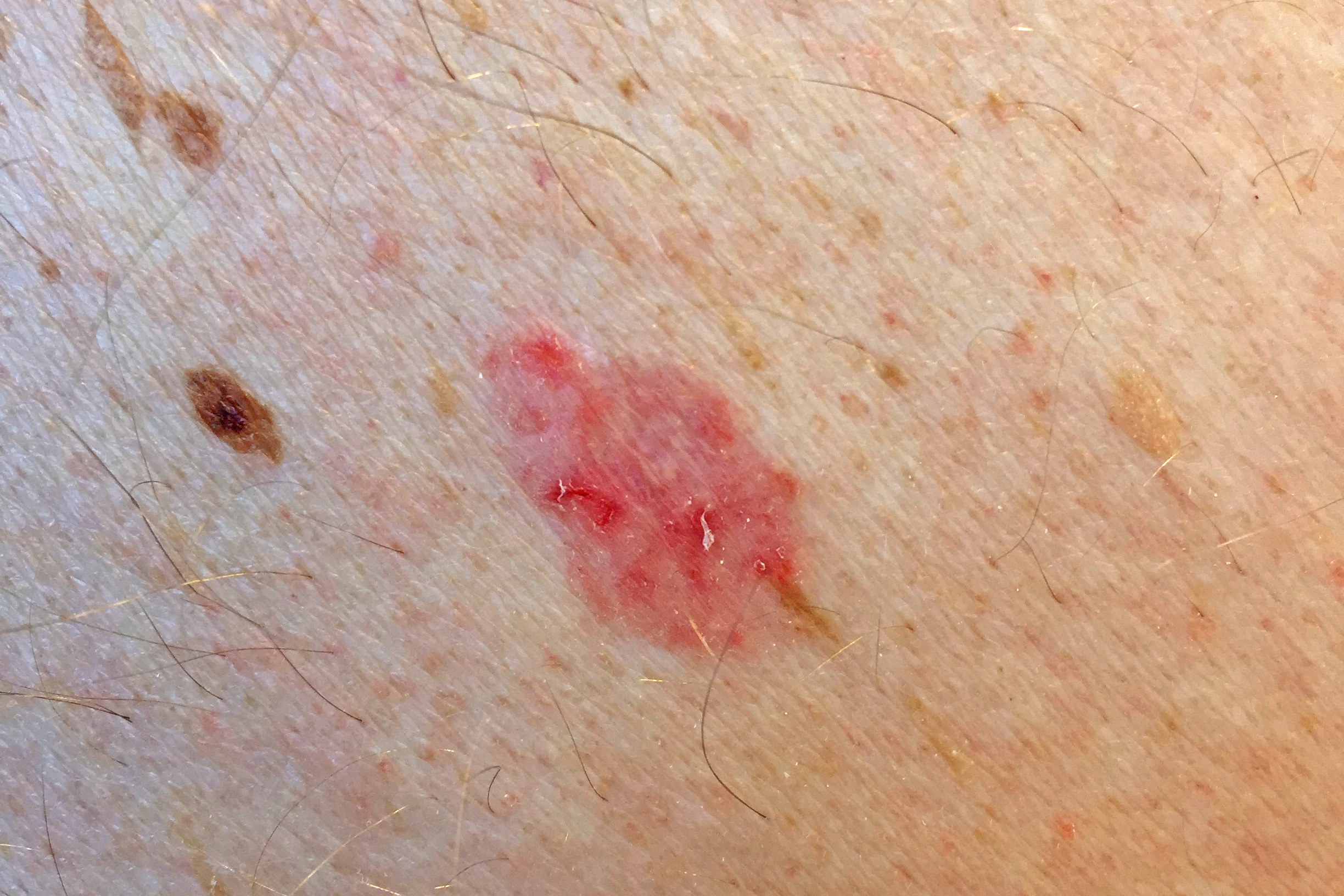Ytlig, eller superficiell, basalcellscancer ser ut som en rodnad fläck. Ibland kan den se ut som en eksemfläck som inte läker fast du smörjer den.